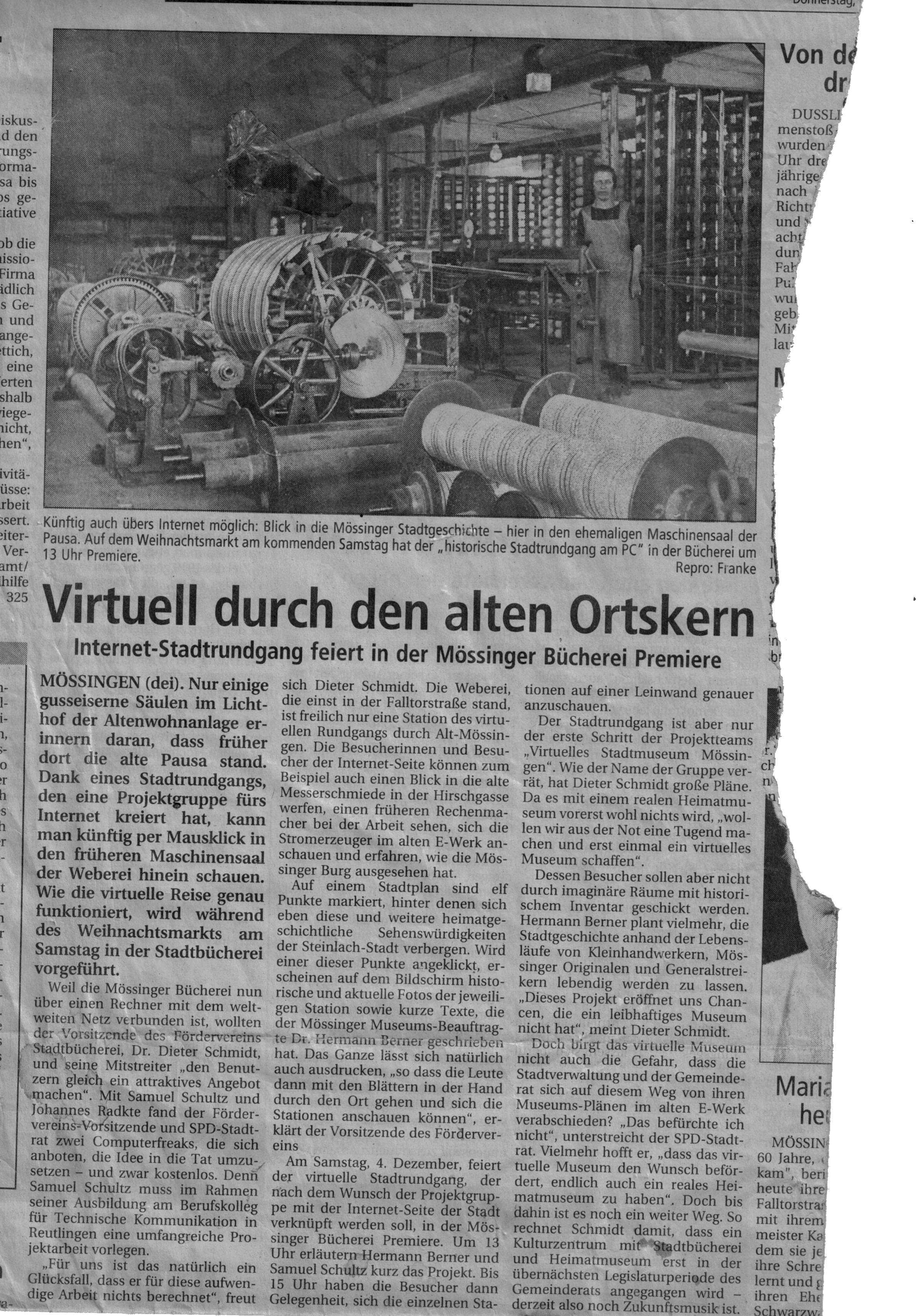 Die ursprünglichen Inhalte entstanden im Rahmen meines Schulprojekts in den Jahren 1998/1999. In Zusammenarbeit mit dem Förderverein der Stadtbücherei Mössingen (unter dem damaligen Vorsitz von Dr. Dieter Schmidt †2025) sowie dem damaligen Museumsleiter Dr. Hermann Berner wurde ein für seine Zeit innovativer interaktiver Stadtrundgang mit verschiedenen multimedialen und interaktiven Elementen realisiert.
