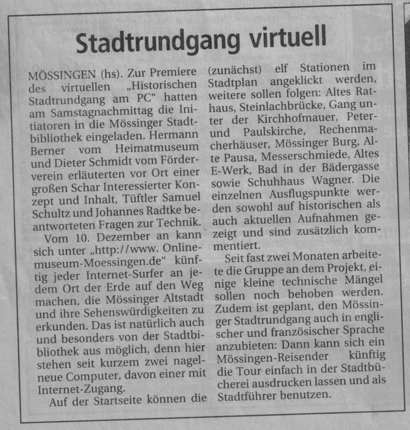 Die ursprünglichen Inhalte entstanden im Rahmen meines Schulprojekts in den Jahren 1998/1999. In Zusammenarbeit mit dem Förderverein der Stadtbücherei Mössingen (unter dem damaligen Vorsitz von Dr. Dieter Schmidt †2025) sowie dem damaligen Museumsleiter Dr. Hermann Berner wurde ein für seine Zeit innovativer interaktiver Stadtrundgang mit verschiedenen multimedialen und interaktiven Elementen realisiert.
